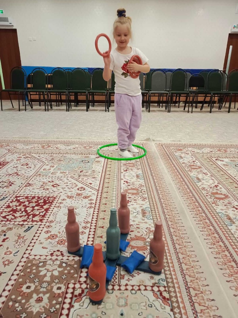 Мектепалды даярлық тобымен өткізілген дене шынықтыру сабағы. Балалар сақиналармен жаттығулар кешенін бекітіп, бірінен соң бірі жүруге, басына қалташаларды қоюға жаттығып, ептілік пен төзімділікті дамытты.