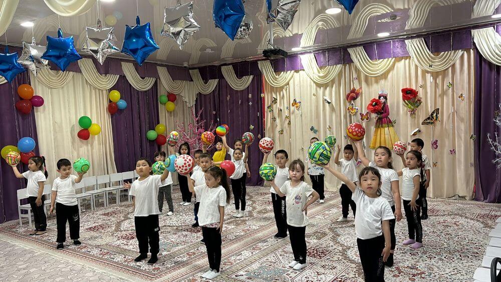 Мақсаты: Балалардың өз бетінше дене шынықтыру жаттығуларымен айналысу дағдыларын қалыптастыру, спорттың жеңіл түрінен ауыр түріне қарай ауысуды күрделендіру, қимыл-қозғалысын арттыру. Жаттығулар: Балалардың күшті, төзімді, епті, дене бітімі түзу әрі әдемі болып өсулеріне бағыт беру, жаттығулардың дұрыс жасалуын қадағалау.