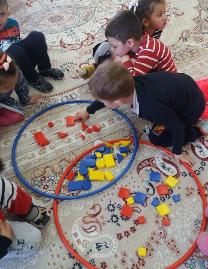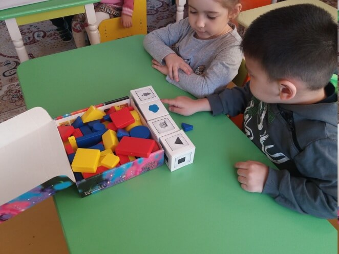 Блоктармен ойындар қолжетімді, көрнекі негізде балаларды нысандардың пішінімен, түсімен, көлемімен және қалыңдығымен таныстырады.