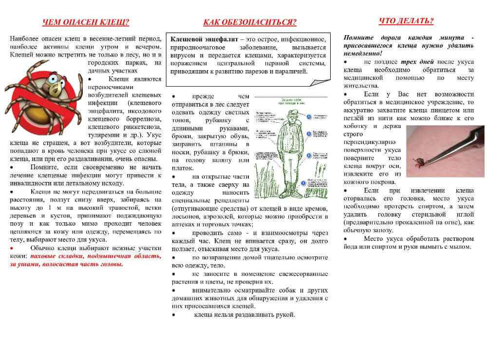 Всем лицам, подвергнувшимся укусам клещей необходимо как можно раньше, не позднее 3-х дней после укуса клеща, обратиться за медицинской помощью в лечебно-профилактические учреждения по месту жительства.