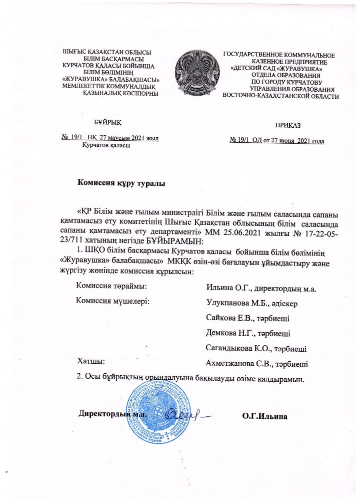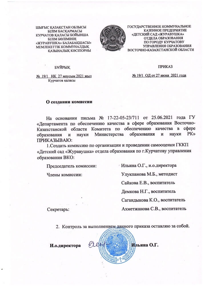 Приказ о создании комиссии по организации и проведению самооценки